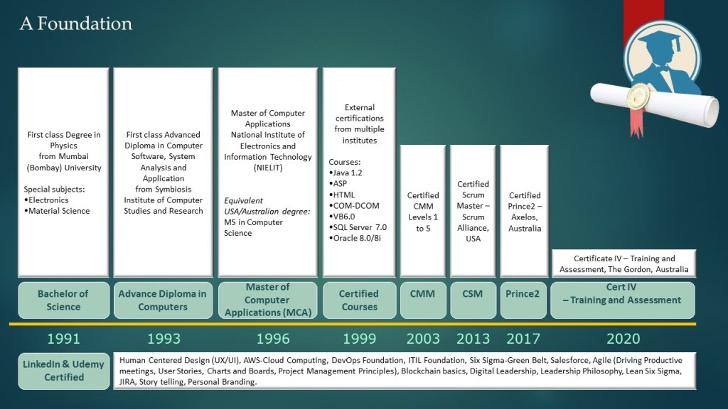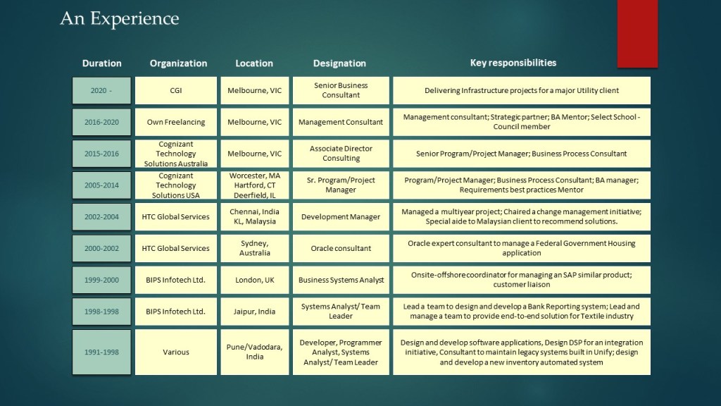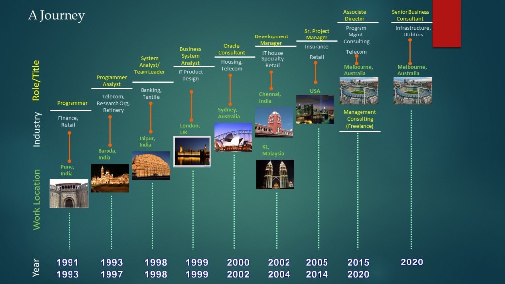 My career profile as on date. My brainchild of visually representing my career to gain more interest from the readers, which is simple and visually striking at the same time. Following is a link that will take you to a 5 page PowerPoint presentation (in PDF format). I have tried my best to summarize ‘Who I am‘, ‘How I have matured’, ‘What I know‘ and ‘What I do‘.