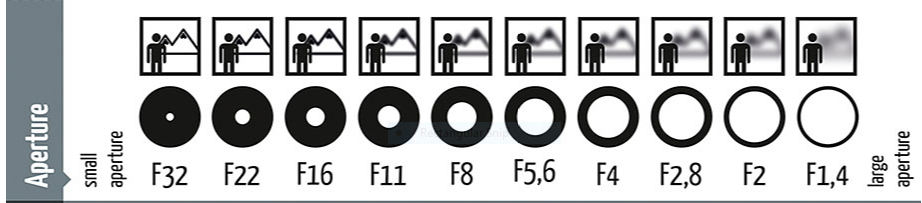 A large aperture enables more lightto hit the sendor for the duration of time shutter is open. Aperture is usually expressed in f/stops (f/1.8, f/5.6). For example, a SMALLER f/stop (f/2.0, f/3.5) number indicates a LARGE aperture . Conversly a LARGE f/stop (f/16, f/22) number indicates a SMALLER aperture. The following picture (Googled) might help understand the factor.