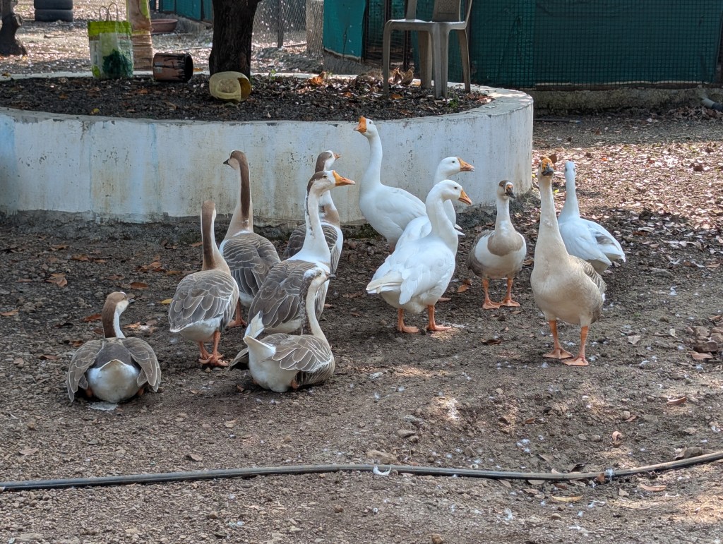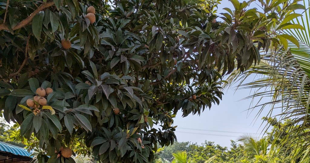 It was a huge farm, mostly with trees bearing chikoos (Sapodilla or Sapota). There were few hammocks tied to the trees. Ducks, handsome ones, were roaming around. There were see-saws, slides, a closed pool, and a short high rope course too. So, all of us (6 of us including our driver) did something to spend our time until being called for lunch. And after a heavy and delicious village style lunch, we gave up (not literally as it was our last stop and it was almost 4pm) and headed back home…!